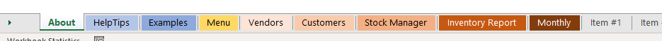 When you open up the Excel Inventory template, you will see a line of named tabs across the bottom of the screen as in the picture below:-